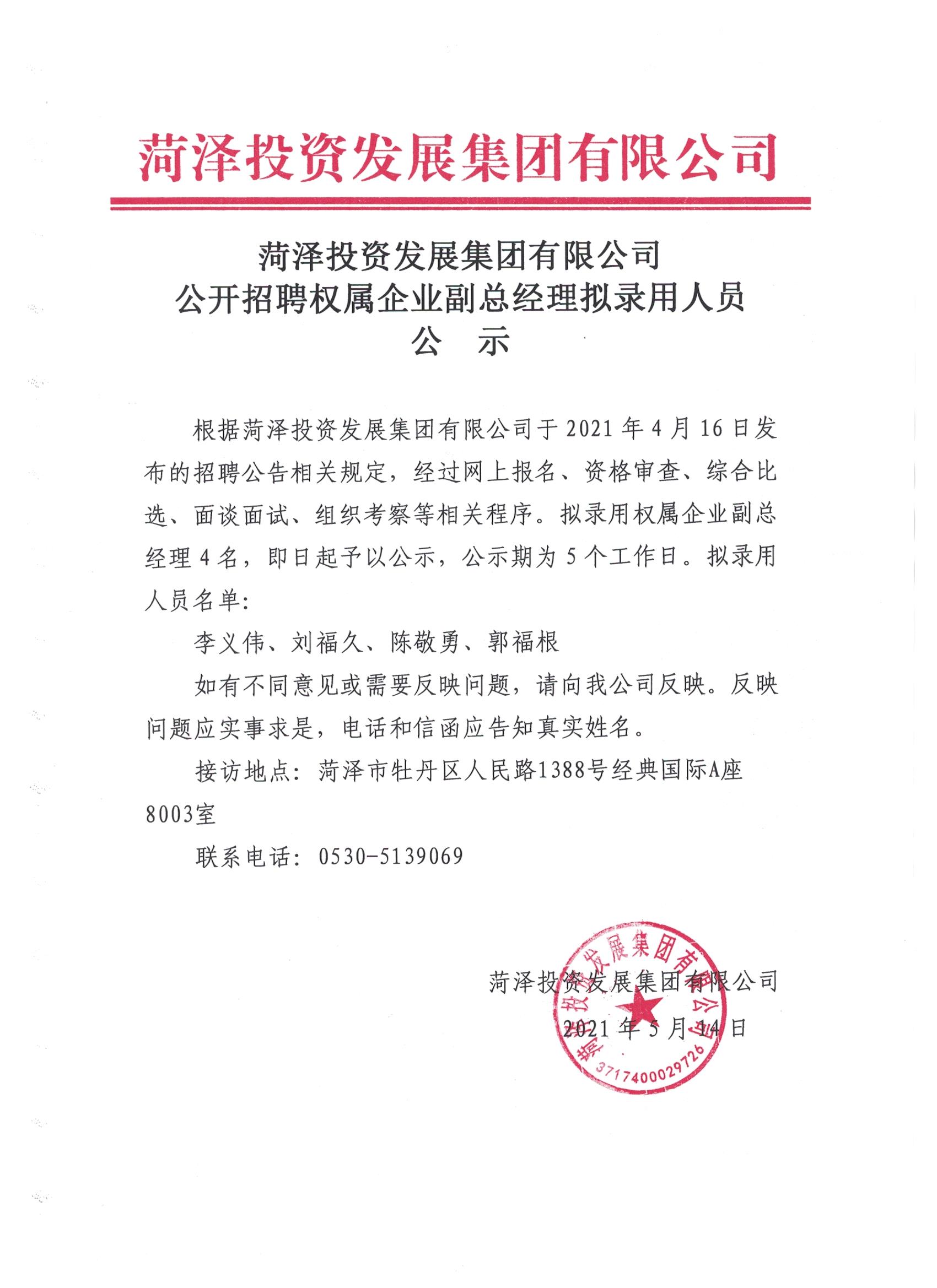 菏澤投資發(fā)展集團有限公司公開招聘權(quán)屬企業(yè)副總經(jīng)理擬錄用人員公示