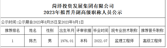 菏澤投資發(fā)展集團有限公司2023年擬晉升副高級職稱人員公示